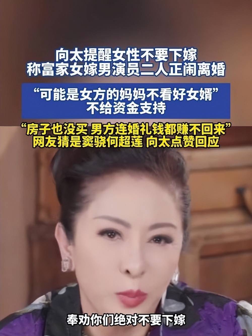 视频中,向太谈及“婚恋观”时坦言,“富家女千万不要下嫁”。