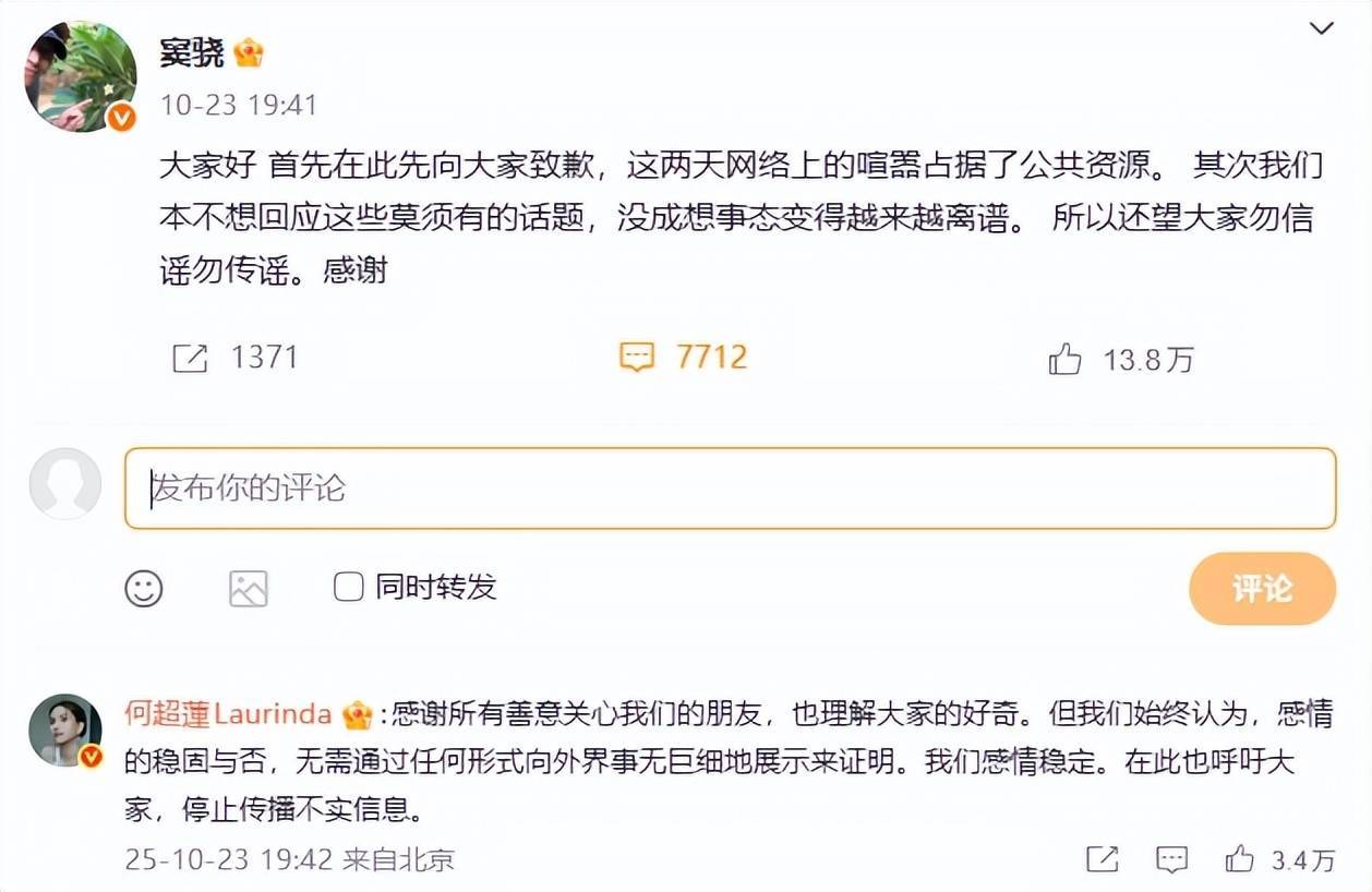 双方发文表示彼此感情稳定,对于外界的无端猜测予以否认。