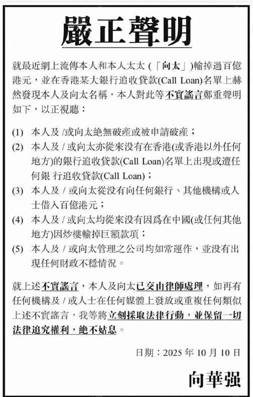 不仅如此,向家还通过香港多家媒体发布正式声明,明确否认所有不实信息,进一步澄清相关谣言。